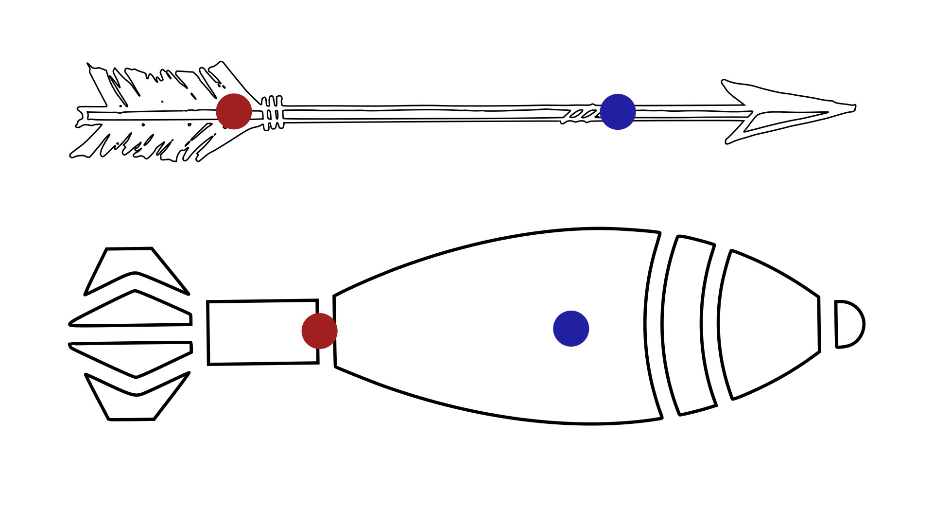 Будь то стрела, мина, авиабомба, снаряд из гладкоствольной танковой пушки — основная масса, например — тяжёлый наконечник или боевая часть, располагается спереди, и сдвигает туда центр тяжести. Оперение же сдвигает назад центр применения силы, отчего снаряд летит «головой вперёд», и встречный поток воздуха его только стабилизирует и выравнивает по траектории.