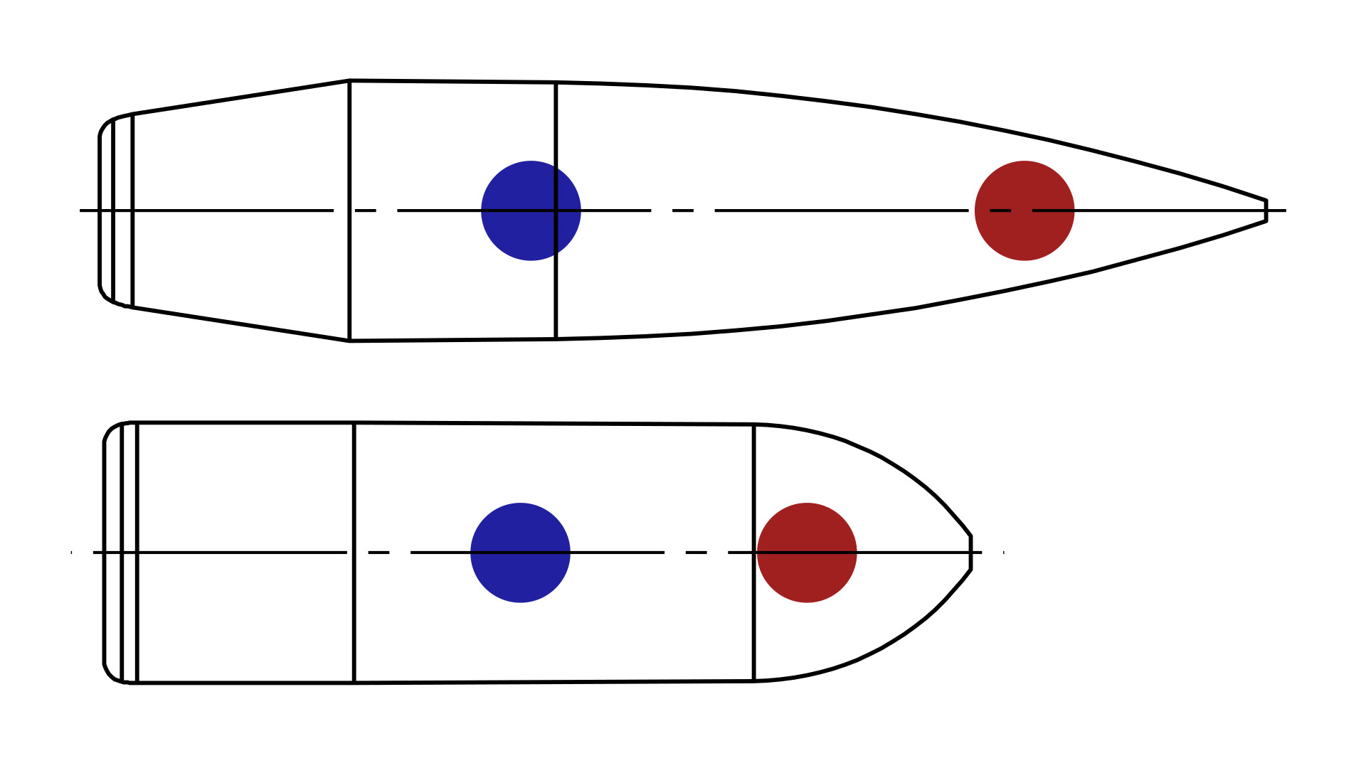 Синим отмечен центр тяжести. Красным отмечен центр применения силы (т. е. встречного потока). Очевидно, что равновесие — очень неустойчивое; как только одно или другое будет немного не по оси, пулю тут же опрокинет встречным потоком воздуха.