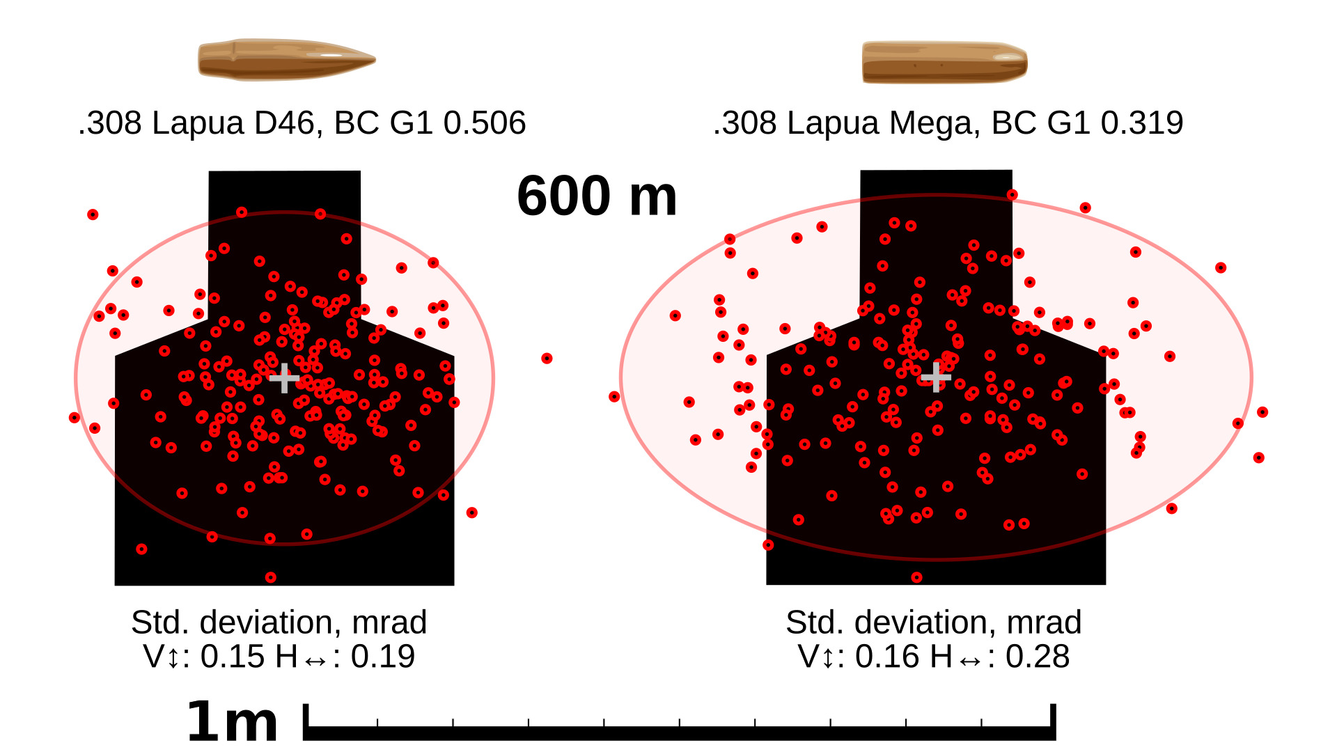 Остроносые пули в сверхзвуковом диапазоне летят значительно лучше тупоносых той же массы. Реши мы, к примеру, отстрелять серию по грудной мишени на 600 м в абсолютно идеальных условиях, но с немного переменчивым ветерком, на практике бы получилось примерно следующее.